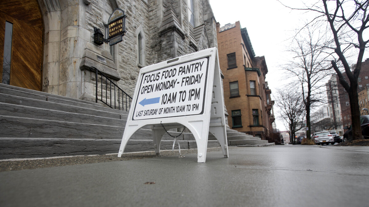 A sign sits on a sidewalk outside the Interfaith Food Pantry at Emmanuel Baptist Church in February in Albany, N.Y. Congress may be under more pressure than usual to cut safety net spending — health care, housing assistance, welfare and food aid — to help pay for Trump's tax cut plans. Mike Groll/AP hide caption
