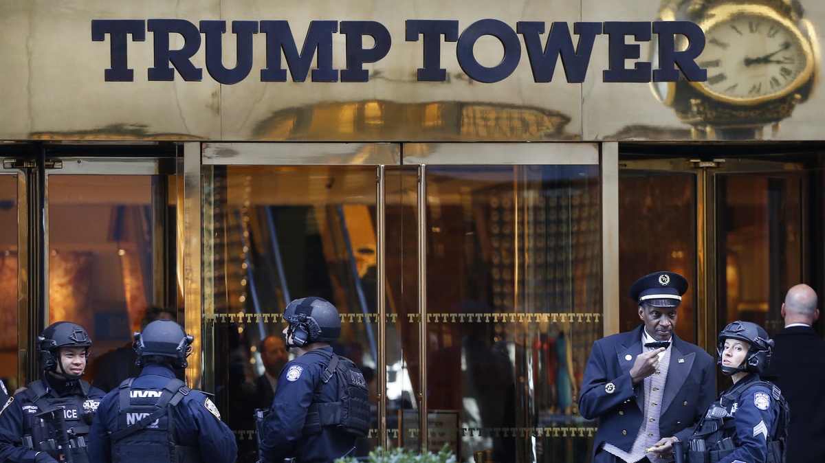 Law enforcement guards an entrance to Trump Tower in New York City, where President-elect Donald Trump is holding meetings with possible Cabinet picks. Mark Lennihan/AP hide caption