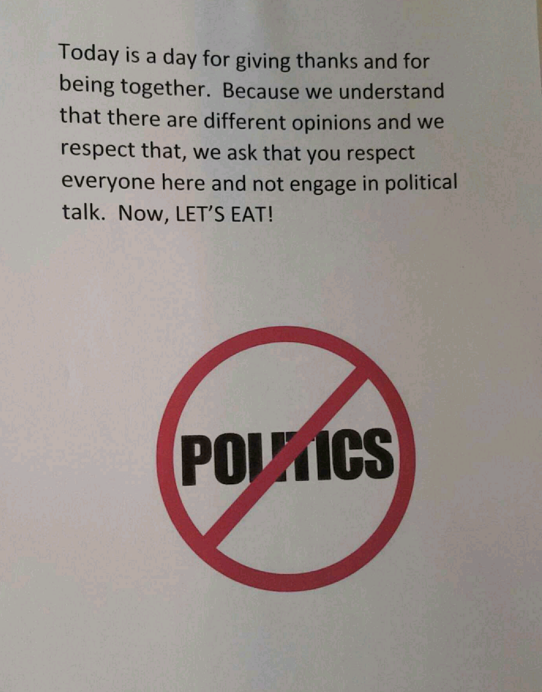 Kendall Patterson: "Knowing that there would be a divided house at Thanksgiving, my aunt printed signs and hung them throughout the house, reminding us to give thanks and leave politics at the door. ...