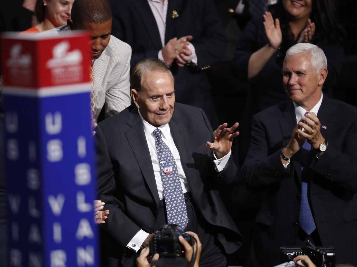 Sen. Robert Dole, seated next to then-vice presidential nominee Mike Pence, receives a standing ovation at the Republican National Convention in July.