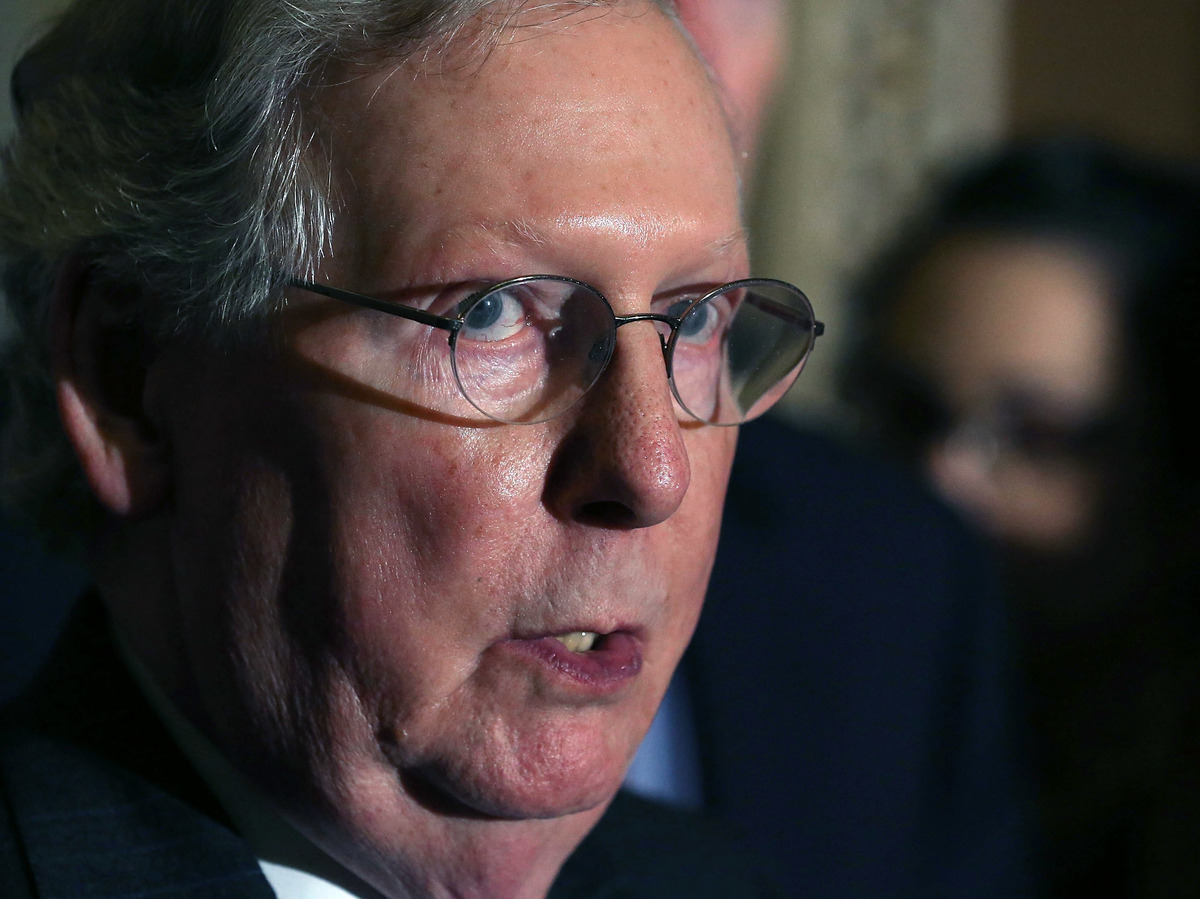 Senate leader Mitch McConnell speaks to the media Feb. 23, 10 days after Justice Scalia's death. He said GOP leadership would deny confirmation hearings for any Obama nominee to fill the vacancy. Mark Wilson/Getty Images hide caption