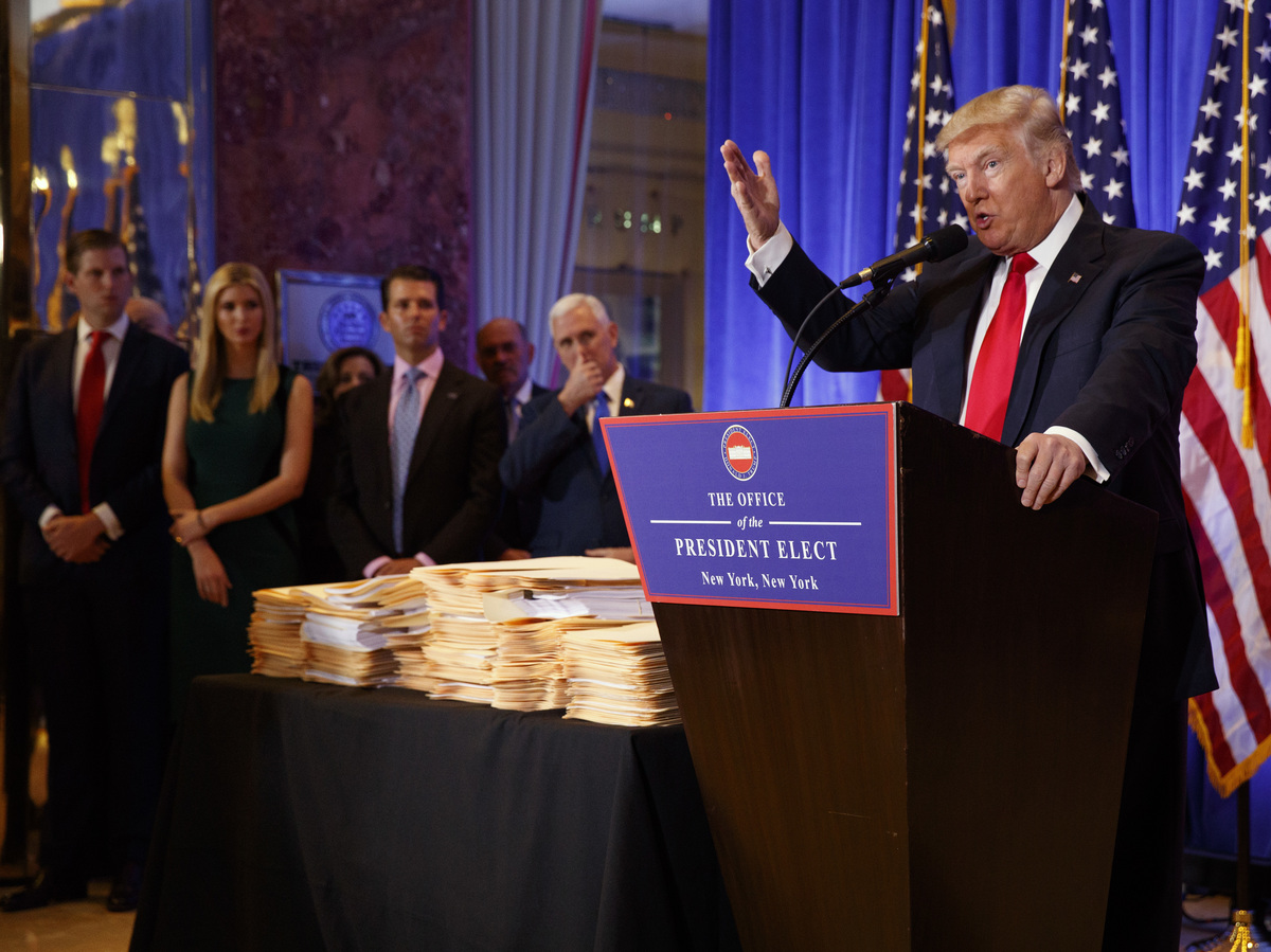 President-elect Donald Trump speaks during a news conference in the lobby of Trump Tower in New York on Wednesday, during which he discussed plans to shift management of his businesses to his sons. Evan Vucci/AP hide caption