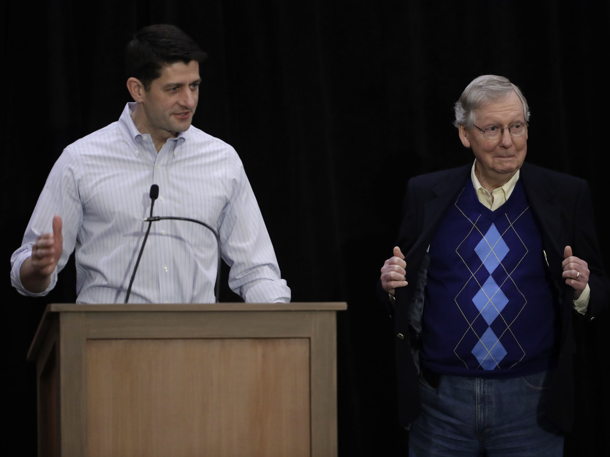 Senate Majority Leader Mitch McConnell (right) opens his coat to show his sweater as House Speaker Paul Ryan speaks with members of the media during the GOP congressional retreat in Philadelphia.