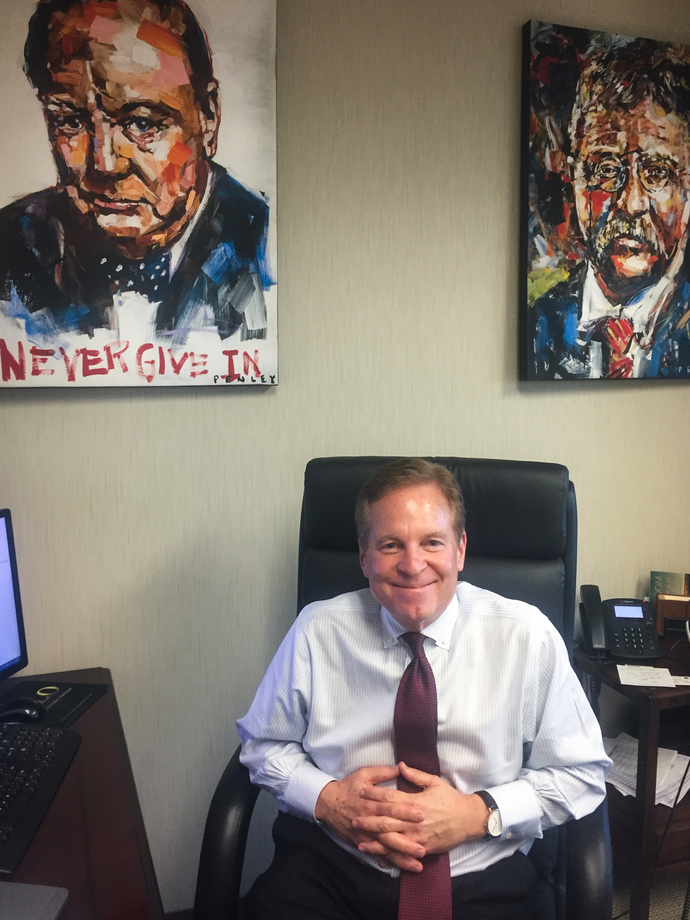 Flock Specialty Finance founder and CEO Michael Flock's desk is flanked by portraits of Winston Churchill and Teddy Roosevelt. He thinks President Trump can be a Republican reformer like Roosevelt.