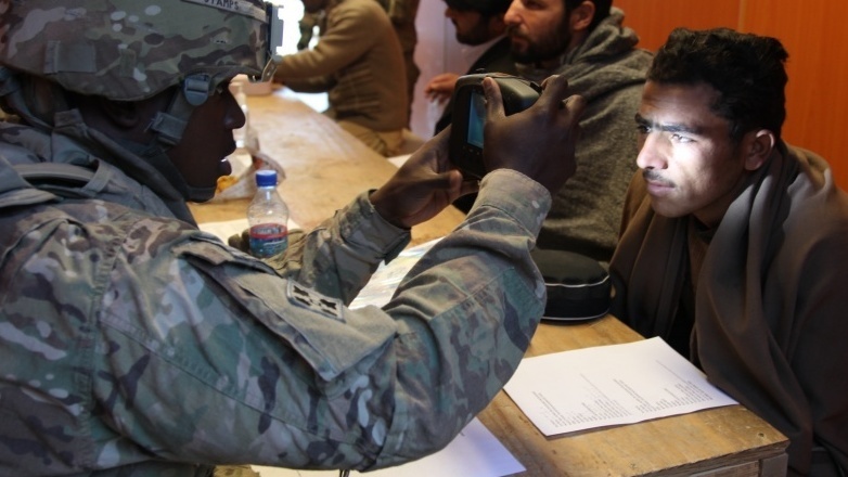 An American soldier scanned the retina of a man in Nangarhar Province, Afghanistan in Dec. 2011. Russia cites the danger of ISIS in Nangarhar as its reason for backing the Taliban, the U.S. says. Sgt. Trey Harvey/U.S. Army hide caption