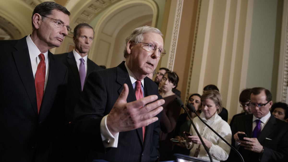 Senate Majority Leader Mitch McConnell and other GOP leaders take questions from reporters about President Trump's ousted national security adviser, Michael Flynn, on Tuesday. J. Scott Applewhite/AP hide caption