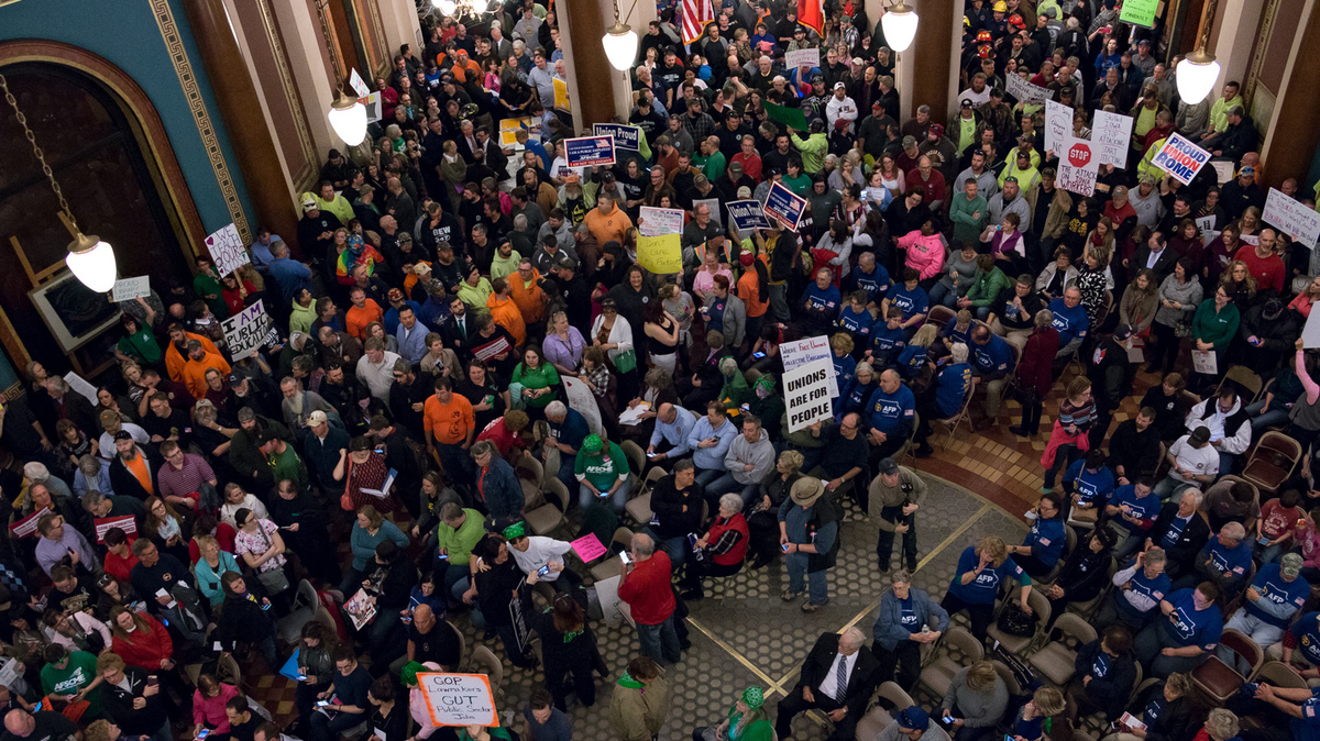 Hundreds of demonstrators on the Iowa Capitol's Rotunda floor protest a bill that would restrict collective bargaining for local and state government workers.