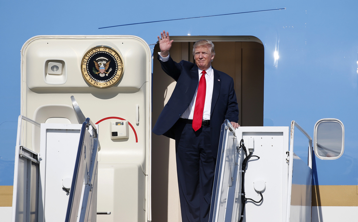 President Trump steps off Air Force One as he arrives in West Palm Beach, Fla., on Friday. The president is holding a rally in the state on Saturday.