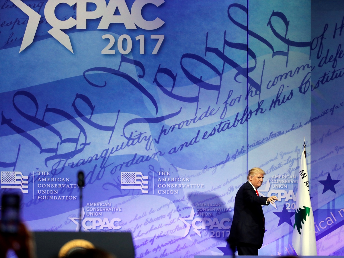 President Donald Trump departs after speaking at the Conservative Political Action Conference on Friday, Feb. 24, 2017, in Oxon Hill, Md. Alex Brandon/AP hide caption