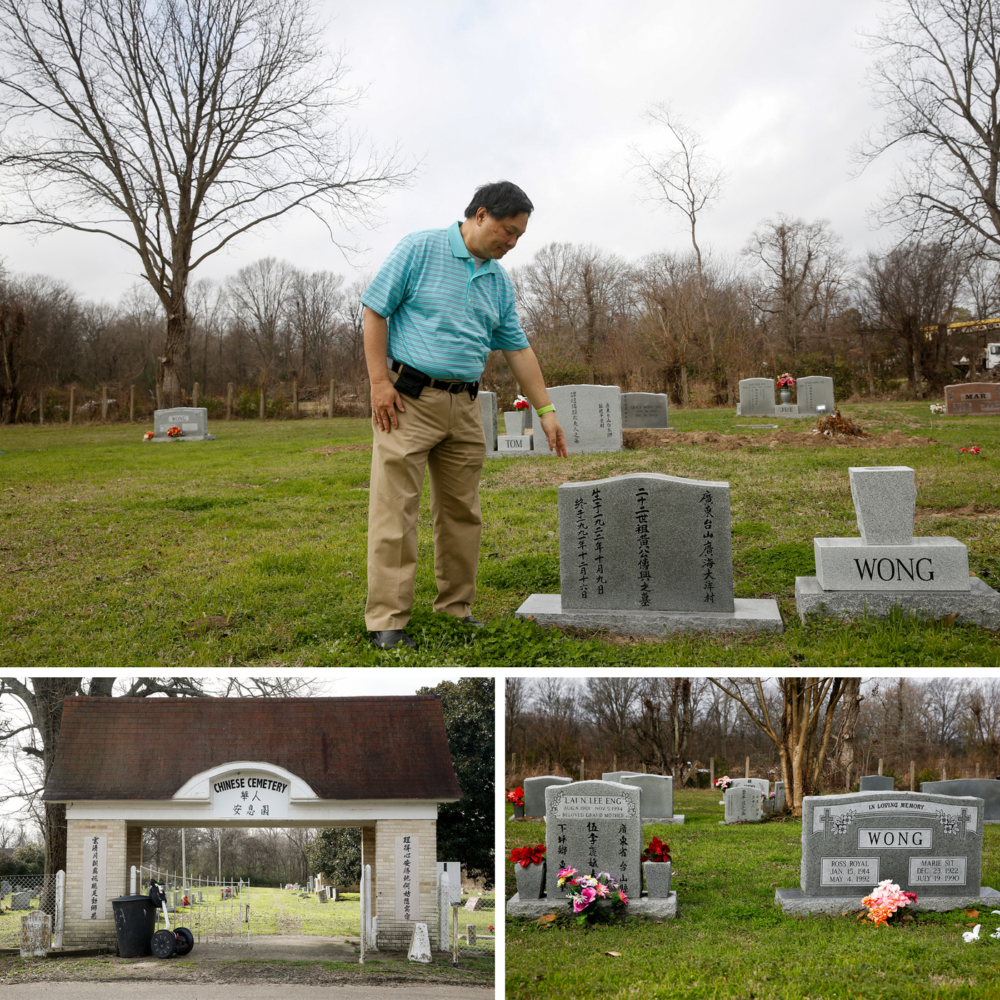 Raymond Wong (top) visits the gravesite where his parents are buried in Greenville, Miss. Wong's parents are buried in the Chinese cemetery, right across from an African-American cemetery. His family has long been part of a thriving, but separate, Chinese community.