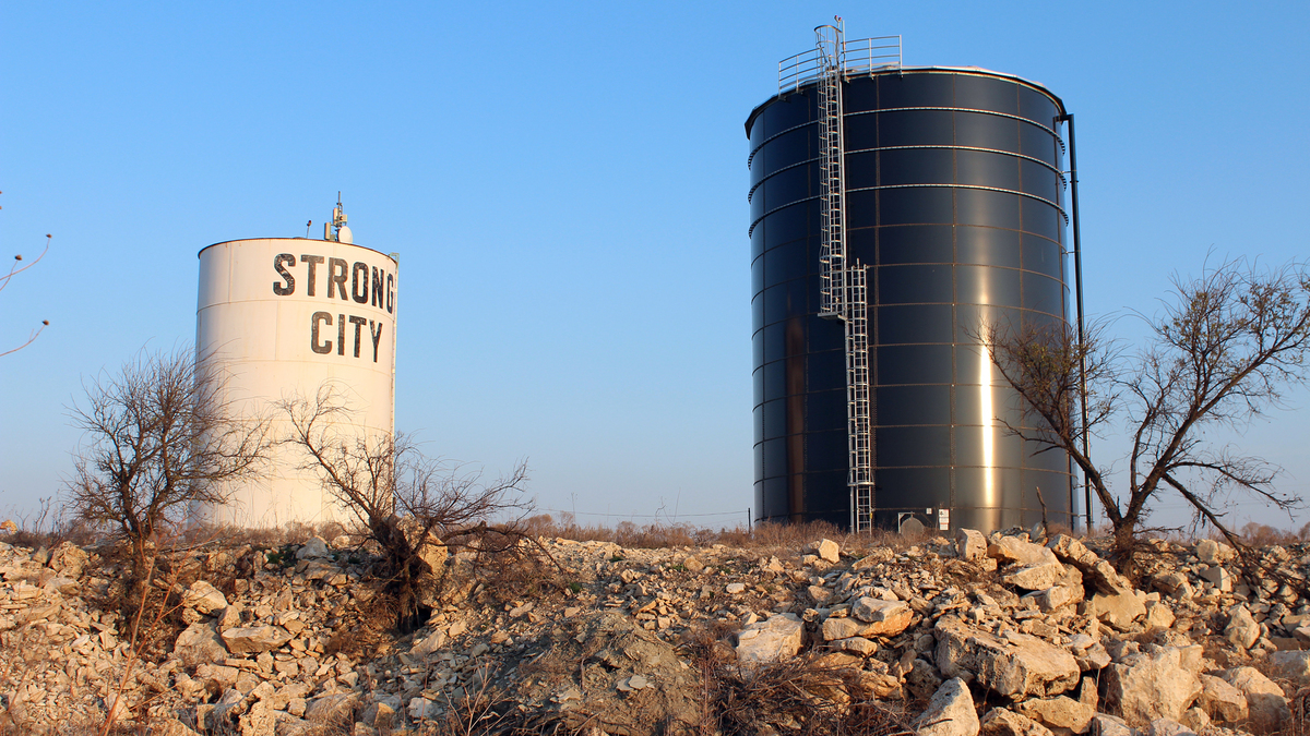 A new water tank in Strong City, Kan., (at right) sits next to one that was part of an old leaky system on a hill just outside the city limits.