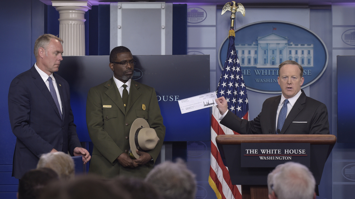 Press secretary Sean Spicer delivered an oversized check for that amount to Interior Secretary Ryan Zinke at the start of Monday's White House briefing. Spicer noted the gift had been approved by the White House counsel.