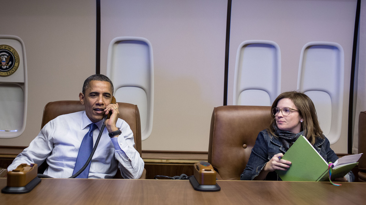 Alyssa Mastromonaco sits with President Barack Obama aboard Air Force One in 2012. Mastromonaco served as the president's director of scheduling and advance from 2009 until 2011, then became his deputy chief of staff for operations from 2011 until 2014.