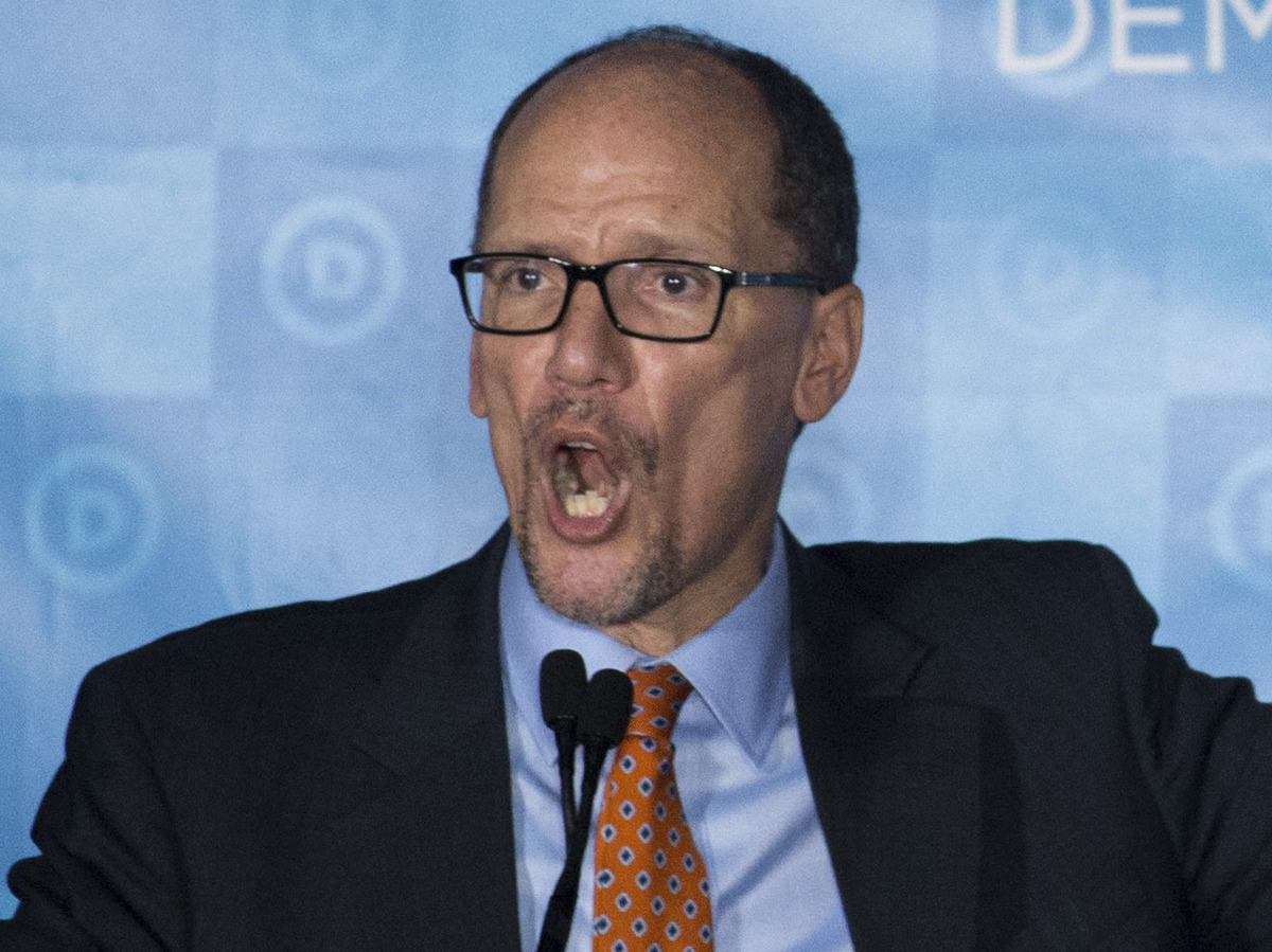 Newly elected Democratic National Committee Chairman Tom Perez gives a victory speech during the general session of the DNC winter meeting in Atlanta, Saturday, Feb. 25, 2017. Branden Camp/AP hide caption