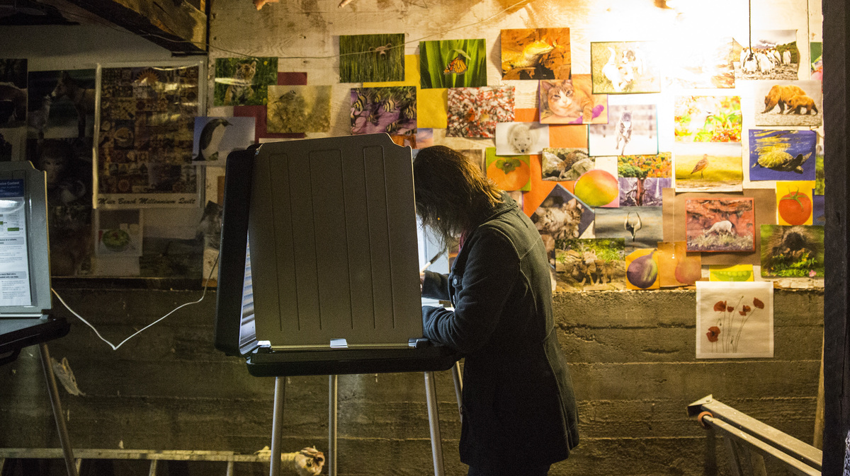 A woman votes in the Potrero Hill neighborhood of San Francisco.