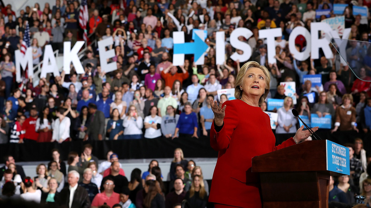 Democratic presidential nominee and former Secretary of State Hillary Clinton speaks during a midnight rally at North Carolina State University hours before the polls opened on Election Day. A glut of late-deciding Trump voters may have contributed to her loss. Justin Sullivan/Getty Images hide caption
