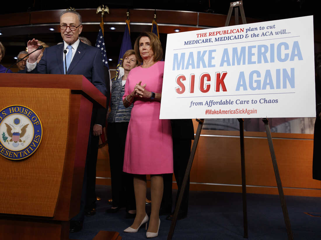 Senate Minority Leader Chuck Schumer, joined by fellow congressional Democrats on Jan. 4, brands what Republicans are trying to do when it comes to health care as "Make America Sick Again." Evan Vucci/AP hide caption