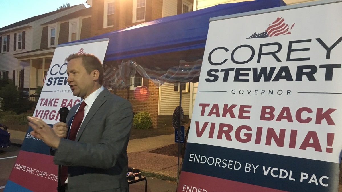 Stewart, a former Trump campaign chairman, also draws frequently from Trump's repertoire: giving opponents catchy nicknames ("Establishment Ed" for Gillespie), and promising to "crack down" on illegal immigration and "take back Virginia." The Minnesota native also is running on a theme of preserving Southern heritage, making multiple statements opposing the removal of Confederate monuments. And he's explicitly appealing to Trump supporters.