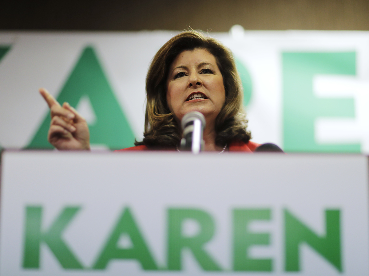 Republican candidate for Georgia's 6th Congressional District Karen Handel updates supporters on early results at an election-night watch party in Roswell, Ga., in April.