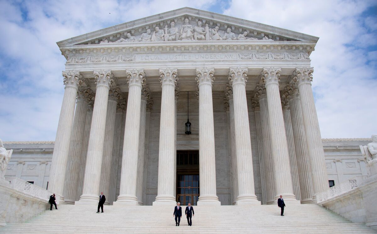 Chief Justice John Roberts (second from right) and Justice Neil Gorsuch (center) walk down the steps of the Supreme Court in Washington, D.C., last week. The court is wrapping up its term, with a handful of consequential cases decided on Monday.
