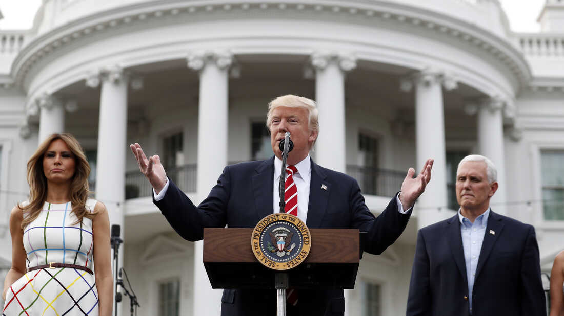 President Donald Trump, center, speaks as first lady Melania Trump and Vice President Mike Pence listen at the Congressional Picnic on the South Lawn of the White House on Thursday, June 22, 2017. Alex Brandon/AP hide caption