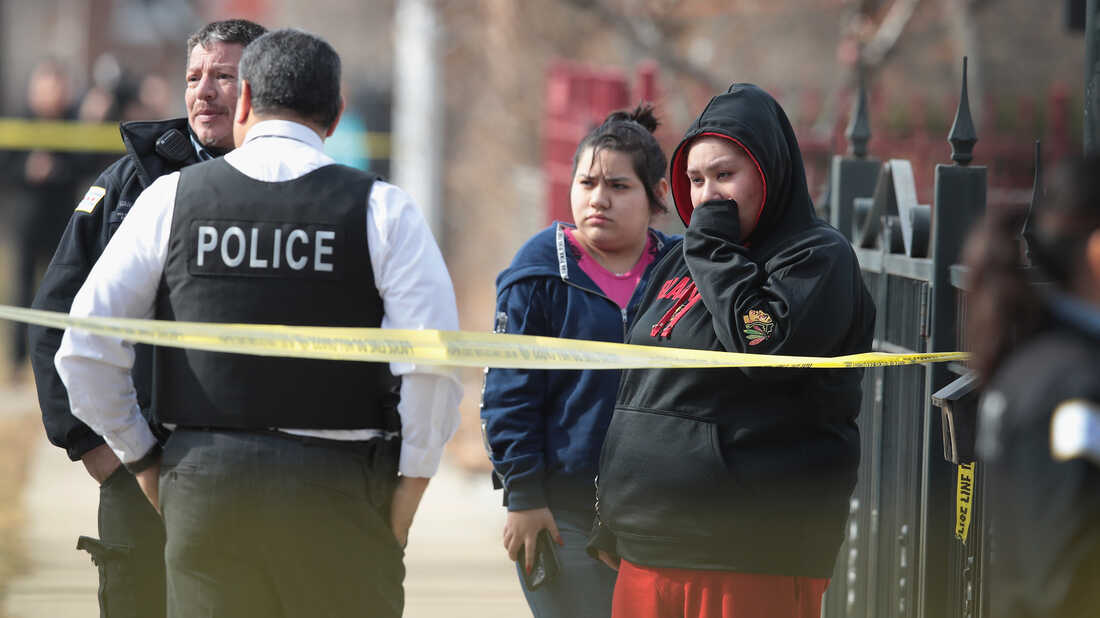 Police investigate the scene of a double homicide in Chicago in February. More than 1,700 people have been shot in the city so far this year. Scott Olson/Getty Images hide caption