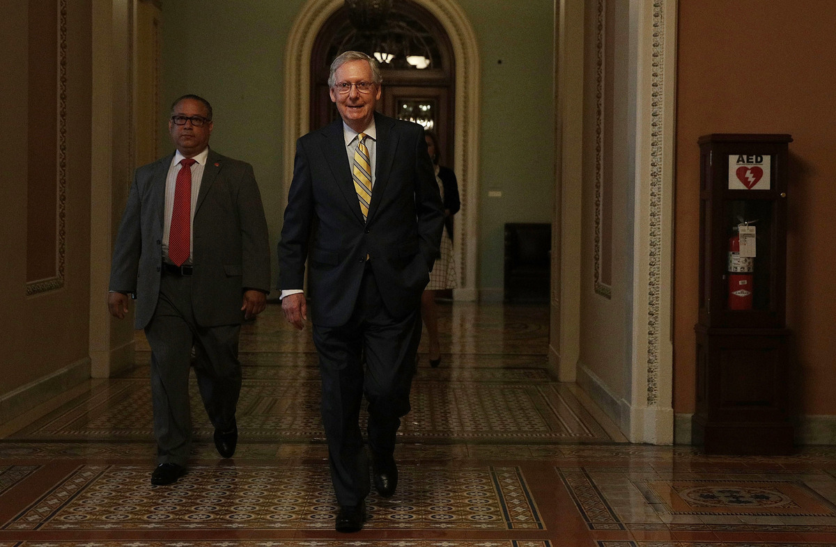 Senate Majority Leader Sen. Mitch McConnell, R-Ky., on his to his office on Thursday at the Capitol in Washington, D.C. Alex Wong/Getty Images hide caption