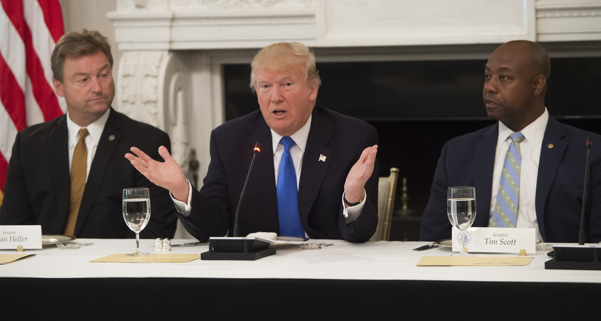 President Trump speaks alongside Republican Sens. Dean Heller of Nevada (left) and Tim Scott of South Carolina during a meeting with lawmakers to discuss the health care bill on Wednesday.