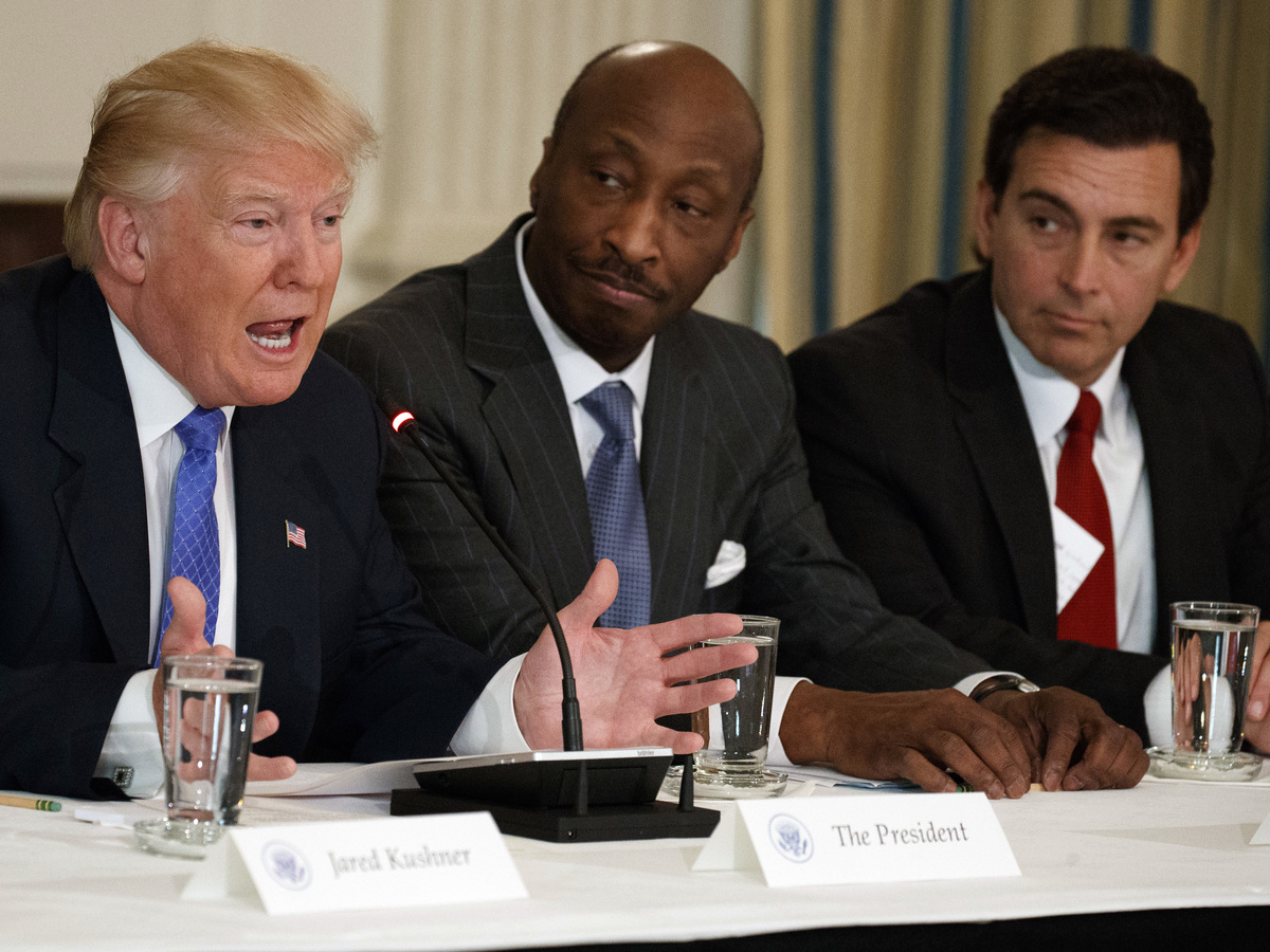 President Trump speaks during a meeting with manufacturing executives at the White House in February, including Merck's Kenneth Frazier (center) and Ford's Mark Fields. Frazier has resigned from the president's manufacturing council.