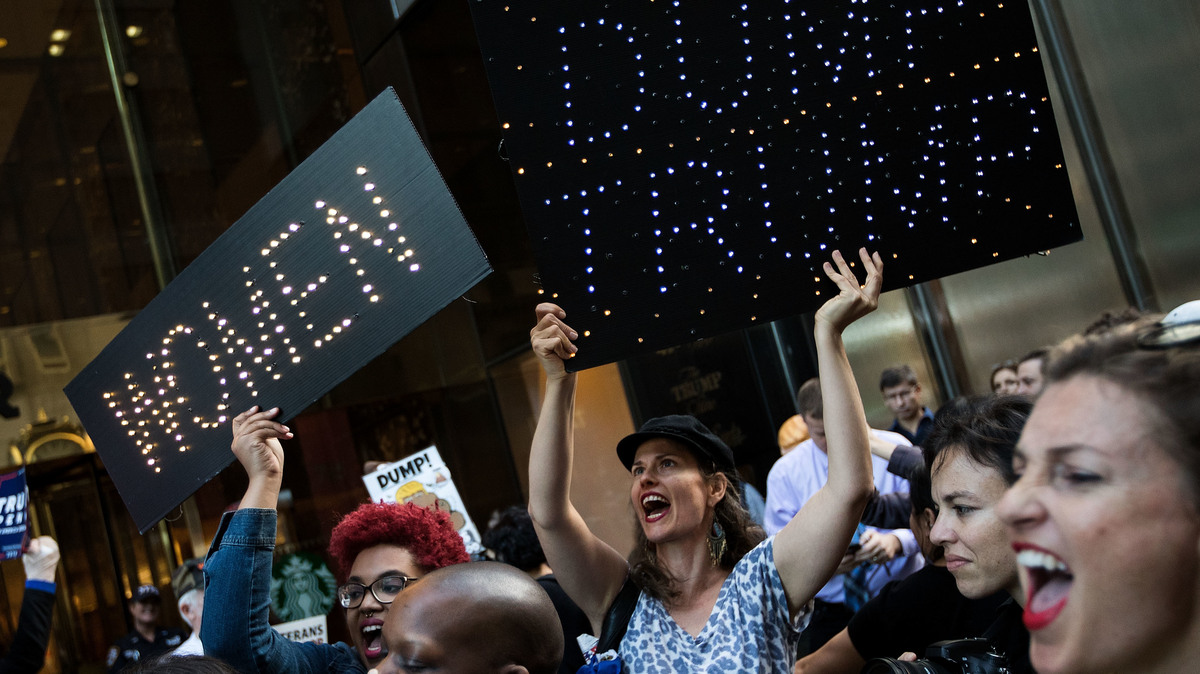 A group of protesters, made up mostly of women, rally against then-Republican presidential candidate Donald Trump outside of Trump Tower in New York City on Nov. 3, 2016. Drew Angerer/Getty Images hide caption