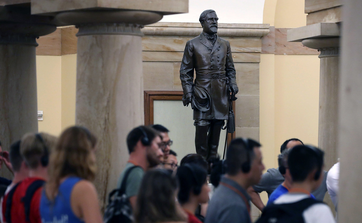 Tourists walk past the statue of Confederate Gen. Robert E. Lee inside the U.S. Capitol on Aug. 17. House Minority Leader Nancy Pelosi, D-Calif., has called for the removal of all Confederate statues from the Capitol building.
