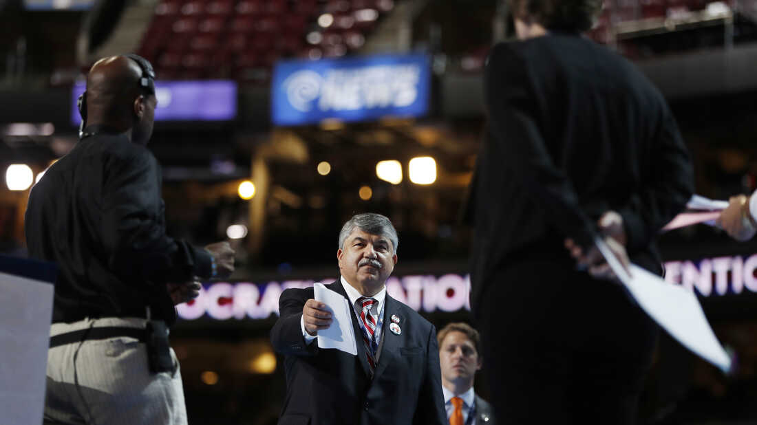 Richard Trumka, president of the AFL-CIO, stands on stage during a walk-through, as he prepares to appear during the 2016 Democratic National Convention in Philadelphia, Ps., on July 25, 2016. Carolyn Kaster/AP hide caption
