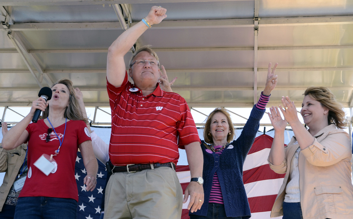 Wisconsin state Sen. Van Wanggaard (center) attends an event at Gorney Park in Caledonia, Wis., in 2012. Mark Hertzberg/AP hide caption