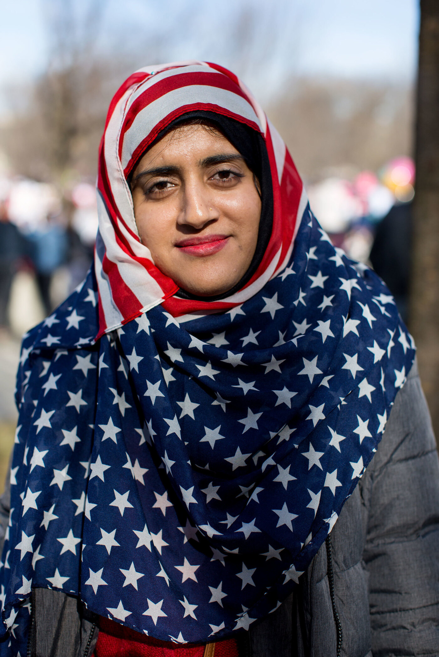Eslah Attar/NPRShabina Shahnawaz of Richmond, Va., stood on a wall, tuning in to a speaker. Shahnawaz, who is Muslim, wore an American flag hijab and held a handmade sign. The first-time protester said she was "happy to be a part of it," and was looking forward to "great change that would include everyone — all the minorities who are held back, who are afraid to come and participate over here."