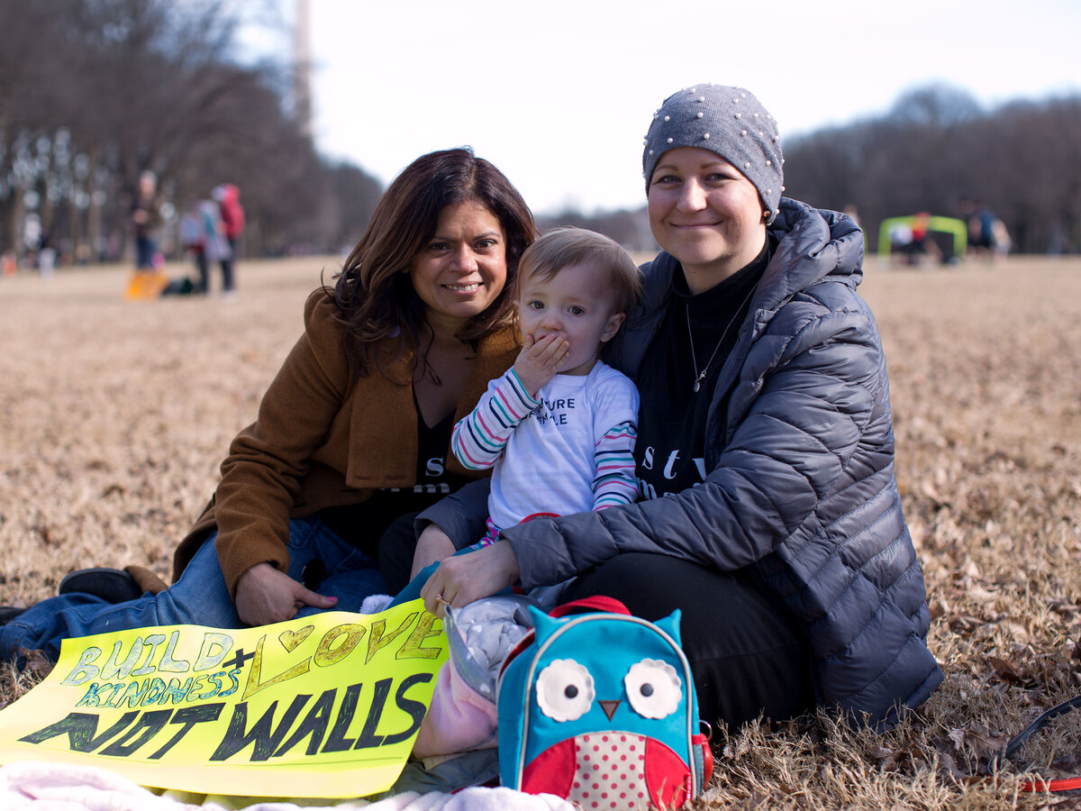 "It's snack time," she said, as Amelia ate crackers out of a plastic, spill-proof snack cup. Beena Patel, a friend of Harkins, sat beside the blanket. Both women attended the 2017 Women's March on Washington. "[Amelia] was in the same onesie," Patel said, "but she's a little taller now."
