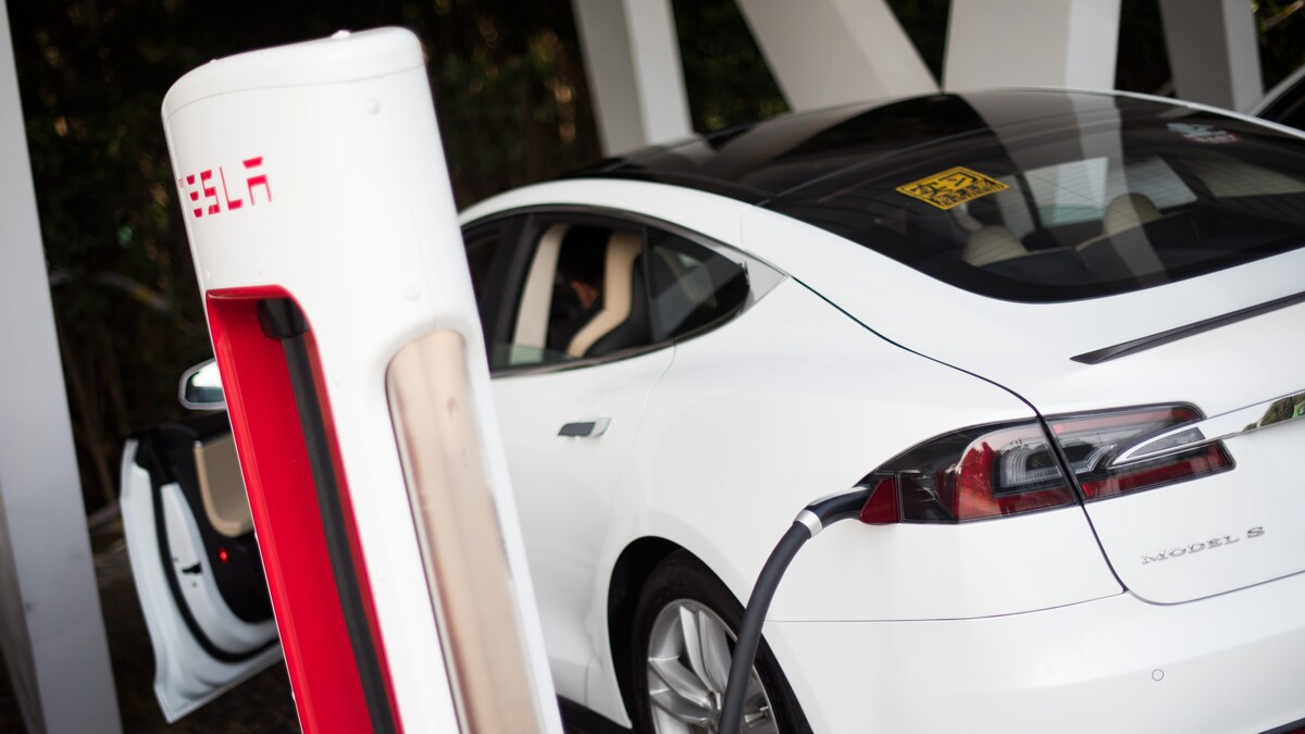 A Tesla Model S electric vehicle is charged at a car dealership in Shanghai, China, in March 2015.
