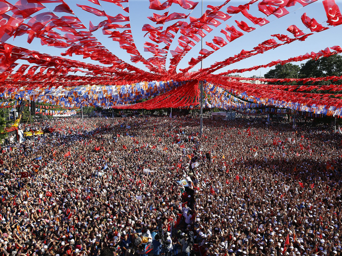 People wave a banner showing Turkey's President Recep Tayyip Erdogan during a gathering of supporters of his ruling Justice and Development Party (AKP) in Istanbul. Lefteris Pitarakis/AP hide caption