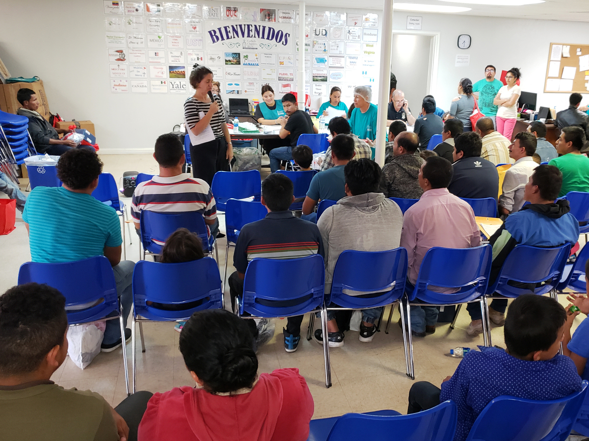 About 100 newly arrived immigrants listen to a volunteer walk them through the process to seek asylum at a Catholic Charities respite center in McAllen, Texas. Mose Buchele/KUT hide caption