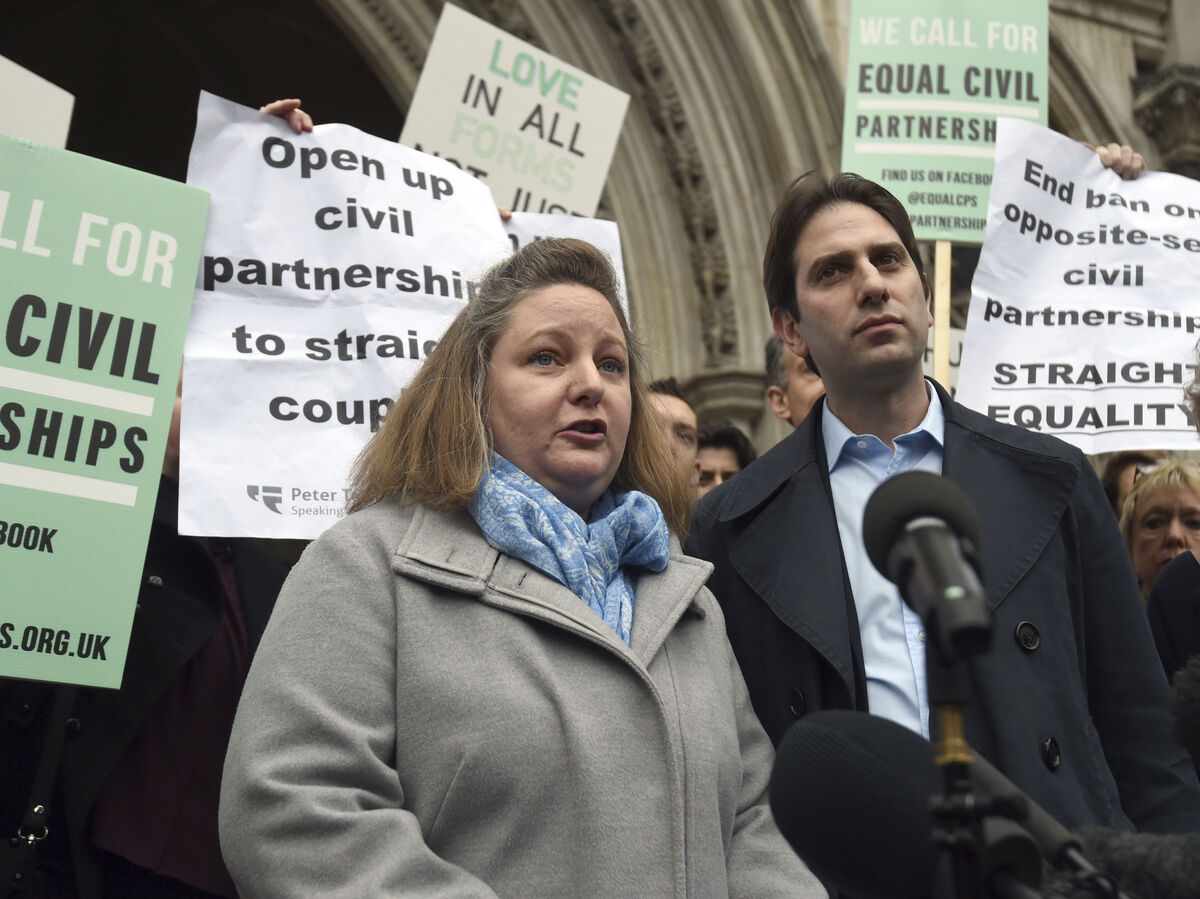 Rebecca Steinfeld, left, and Charles Keidan, shown outside London's Royal Courts of Justice in 2017, wanted their relationship recognized in law without the "patriarchal baggage" of marriage. They said they faced discrimination because only same-sex couples were eligible for civil partnerships.