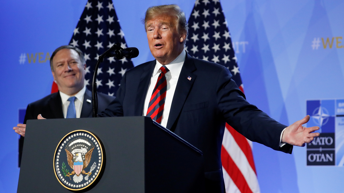 President Trump said Thursday that he has succeeded in getting U.S. allies to pledge more money for the alliance. Secretary of State Mike Pompeo looked on at a news conference after the NATO summit in Brussels. Kevin Lamarque/Reuters hide caption