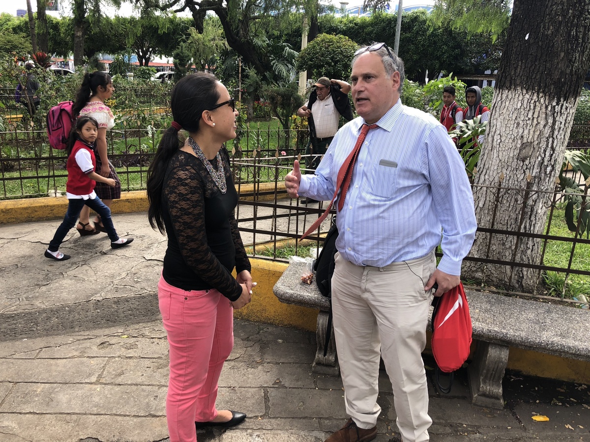 Lesly Tayes, a Guatemalan human rights lawyer and Lee Gelernt, lead ACLU lawyer, are part of an effort to reunite parents in Guatemala with their kids still being held in the U.S. They are standing in the central park in Chimaltenango, a town about two hours west of Guatemala City, Guatemala. John Burnett/NPR hide caption
