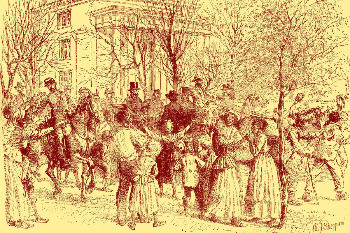 Abraham Lincoln is shown in Richmond, Va., being cheered by former slaves in 1865.