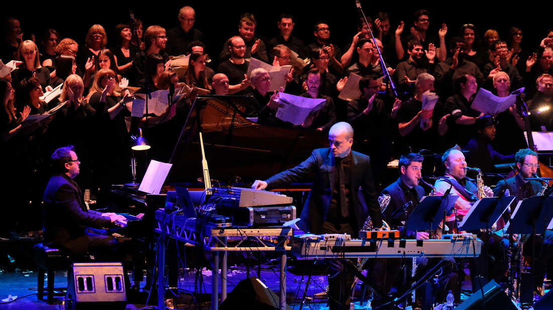 The Matthew Herbert Brexit Big Band, with the London Brexit Choir, performing at the Barbican Centre in 2017.