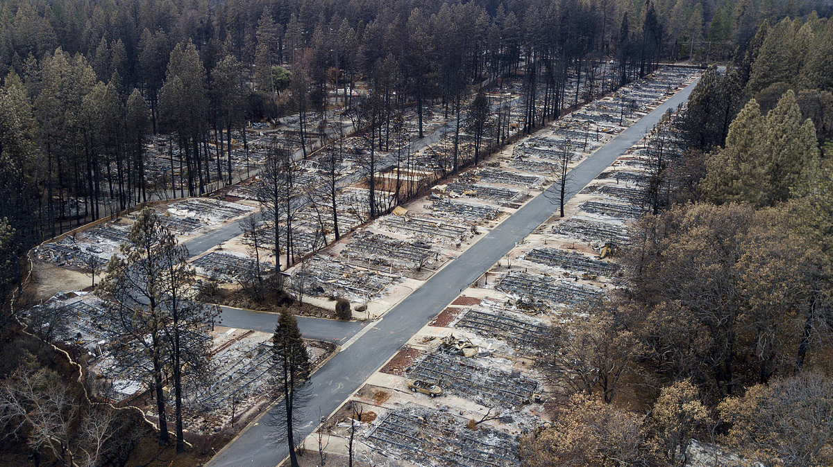 The Camp Fire leveled homes in the Ridgewood Mobile Home Park retirement community late last year in Paradise, Calif. The state's largest utility, PG&E, may face billions in liability costs if its equipment is found to be responsible for igniting the fire.