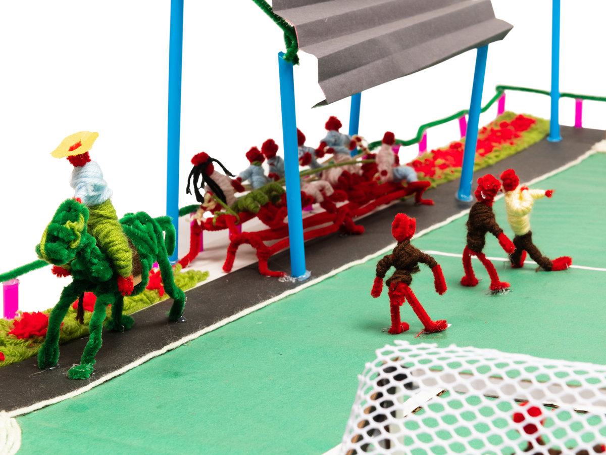 A close-up of a piece depicting a soccer match made using construction paper, yarn and pipe cleaners. Courtesy of Dr. David Dorado Romo hide caption