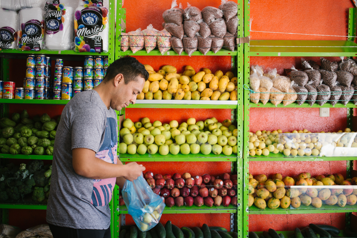 Olivas-Bejarano shops for fruit at a market in León this month. His Spanish has improved in the nearly two years he has lived in Mexico, but his American accent is noticeable among a large bilingual community. Alicia Vera for NPR hide caption