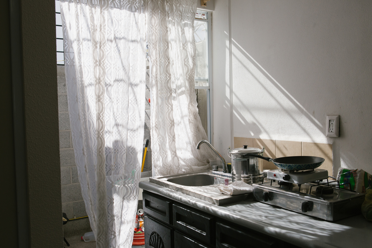 The sun enters Olivas-Bejarano's kitchen in his León home, furnished with hand-me-downs.