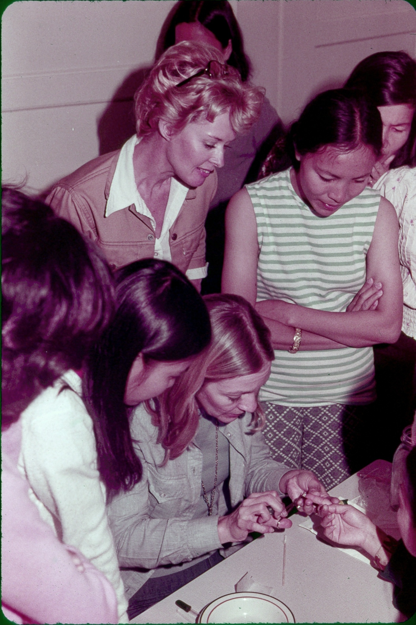 In 1975, actress Tippi Hedren (standing, left) brought her personal manicurist, Dusty Coots, to teach her trade to a group of 20 Vietnamese women in a California refugee camp.