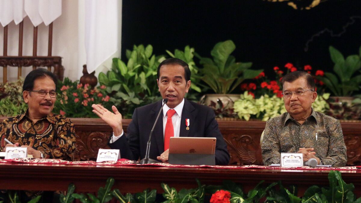 Indonesian President Joko Widodo (center) says the new capital city will be in East Kalimantan province on the island of Borneo. He's seen on Monday with Vice President Jusuf Kalla (right) and Minister of Agriculture and Land Planning Sofyan Djalil.