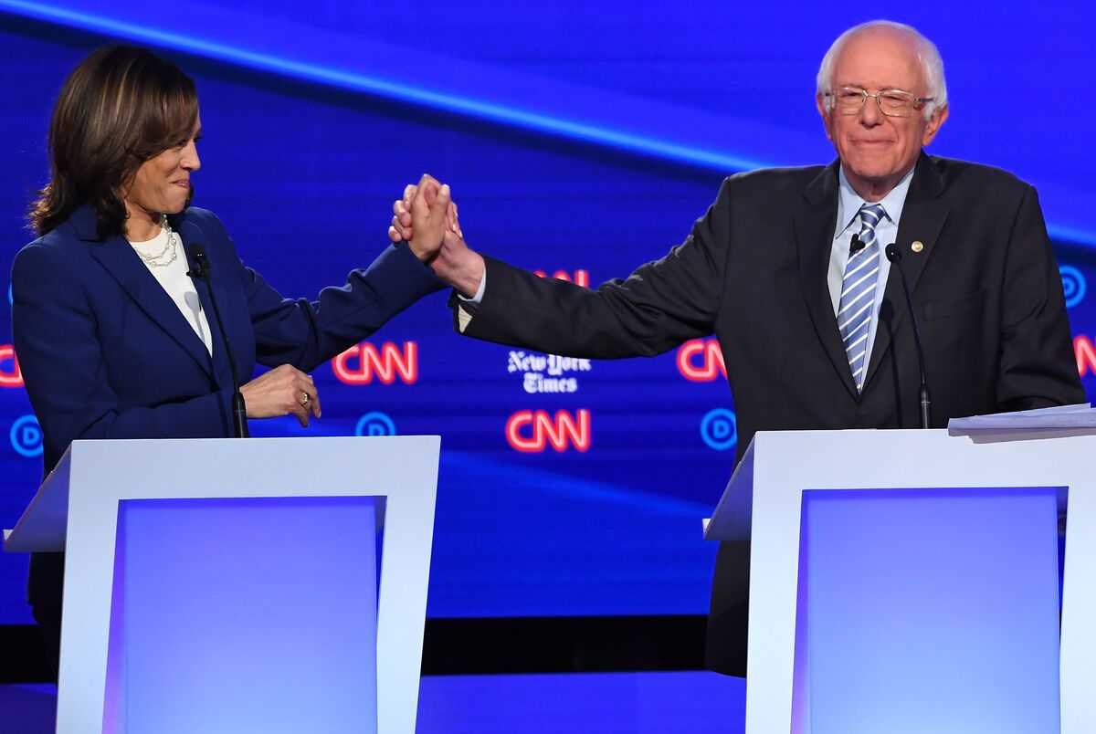 Democratic presidential hopefuls California Sen. Kamala Harris and Vermont Sen. Bernie Sanders during the fourth Democratic primary debate of the 2020 presidential campaign season. Saul Loeb/AFP via Getty Images hide caption